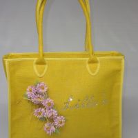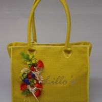 BORSA IN TESSUTO JUTA COL. GIALLO MOD.FIORI DI CAMPO CON APPLICAZIONI FLOREALI COLORATE